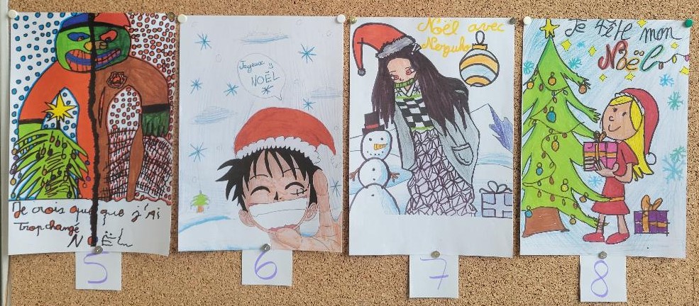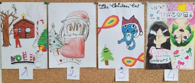 Nos artistes en herbe ont travaillé autour des thèmes de l’amitié, de Noël, ou des deux… Ils devaient inventer une couverture de manga en respectant quelques consignes :