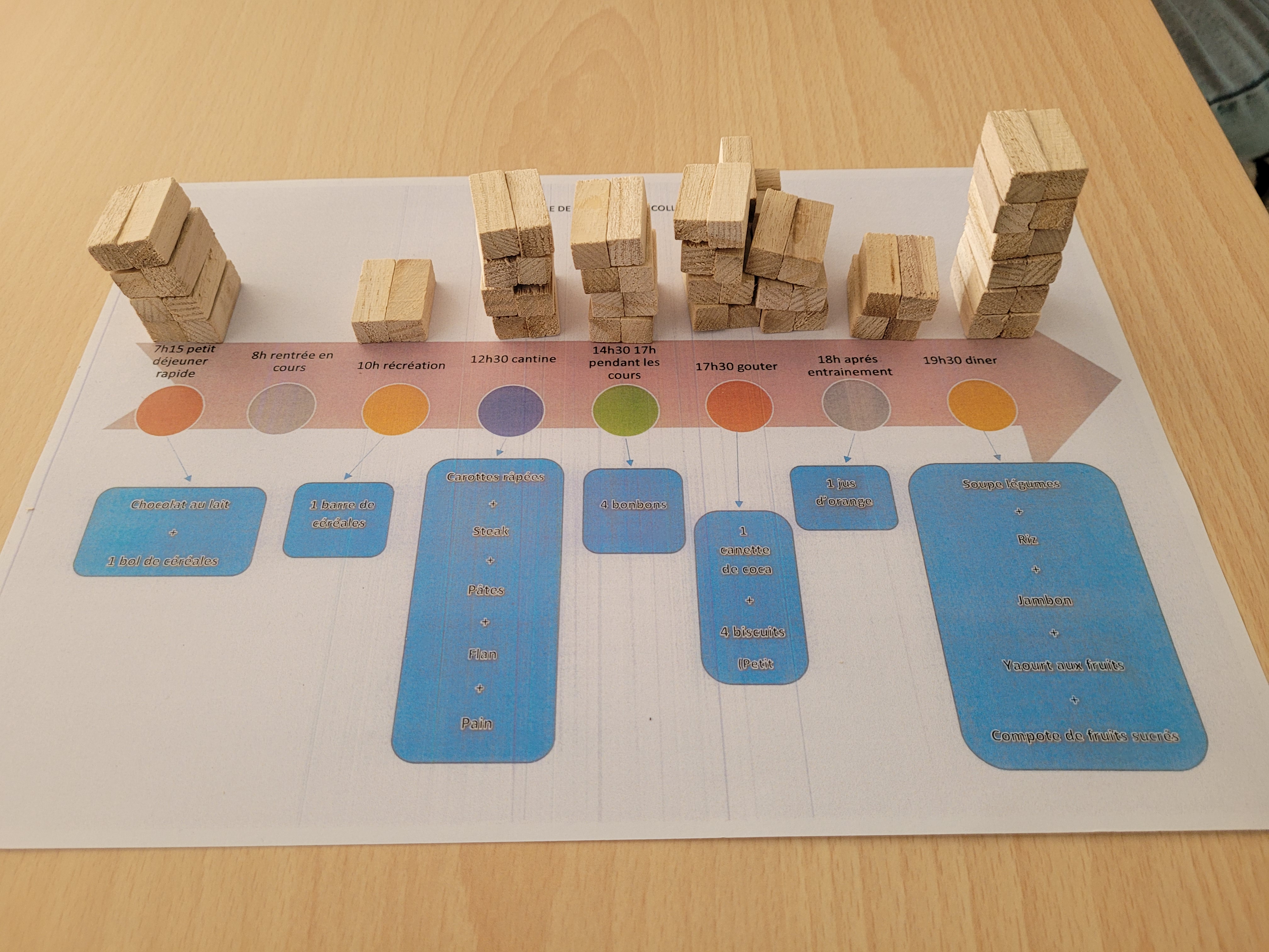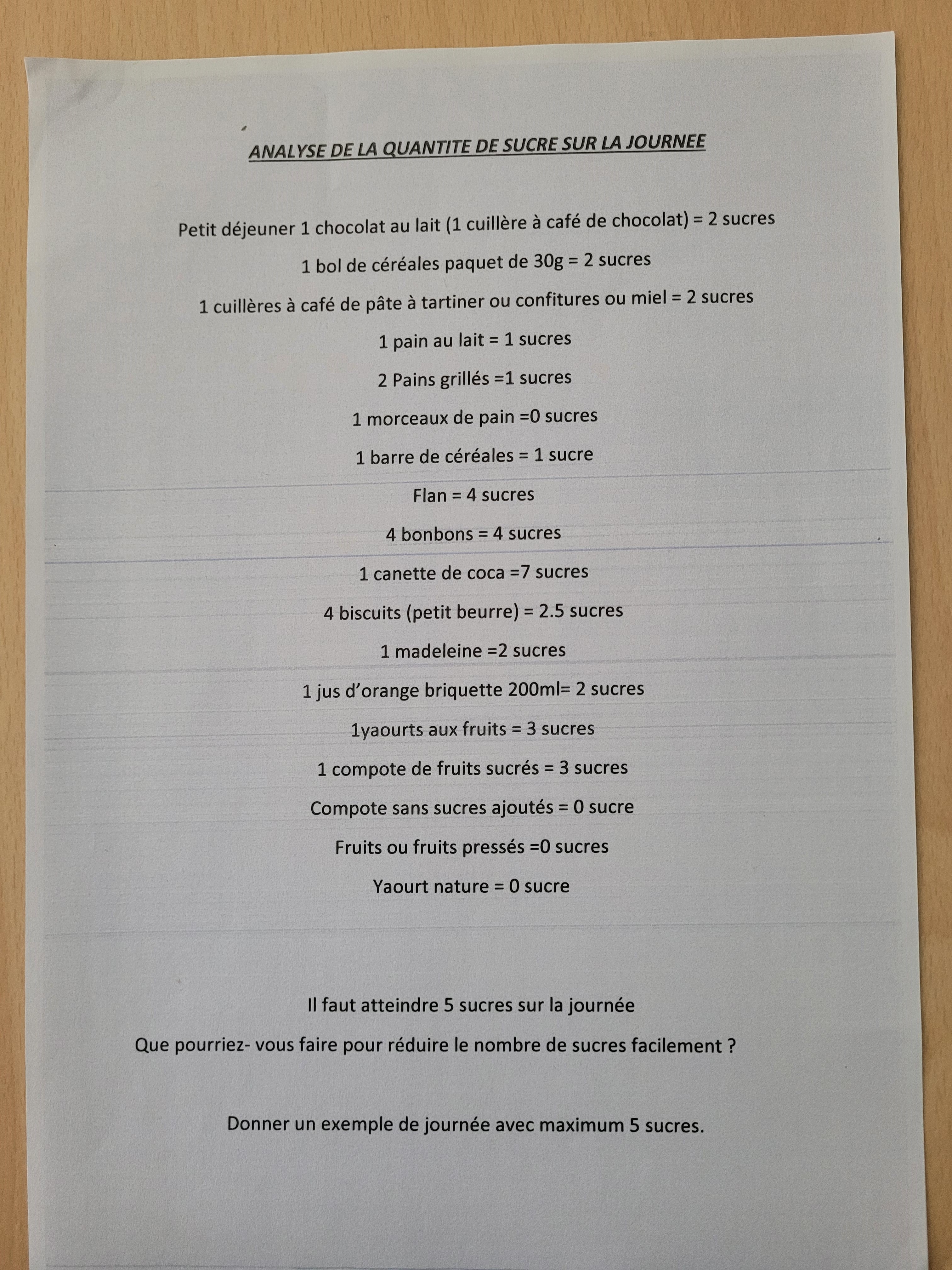 Les élèves ont, ensuite, travaillé en groupe sur la consommation moyenne de sucres ajoutés, présents dans les produits transformés, à partir d’un menu journalier standard chez un collégien. Cet exercice a permis une prise de conscience chez les élèves puisqu’il a été recensé 30.5 sucres (= 152.5 grammes) consommés par jour, les recommandations pour un adolescent étant de 5 sucres (= 25 grammes) par jour.
